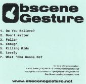 | OBSCENE GESTURE - PROMO great old school Thrash Metal & Punk music. This demo took me back to the mid 80's when Metal & Punk were crossing over in a big way. The music has a cool Thrash Metal vibe mixed together you'd get these guys!. The band features members of AGENT STEEL, BODY COUNT & STEEL PROPHET. This is well worth checking out, especially now before they get signed & blow up!! www.OBSCENEGESTURE.net |